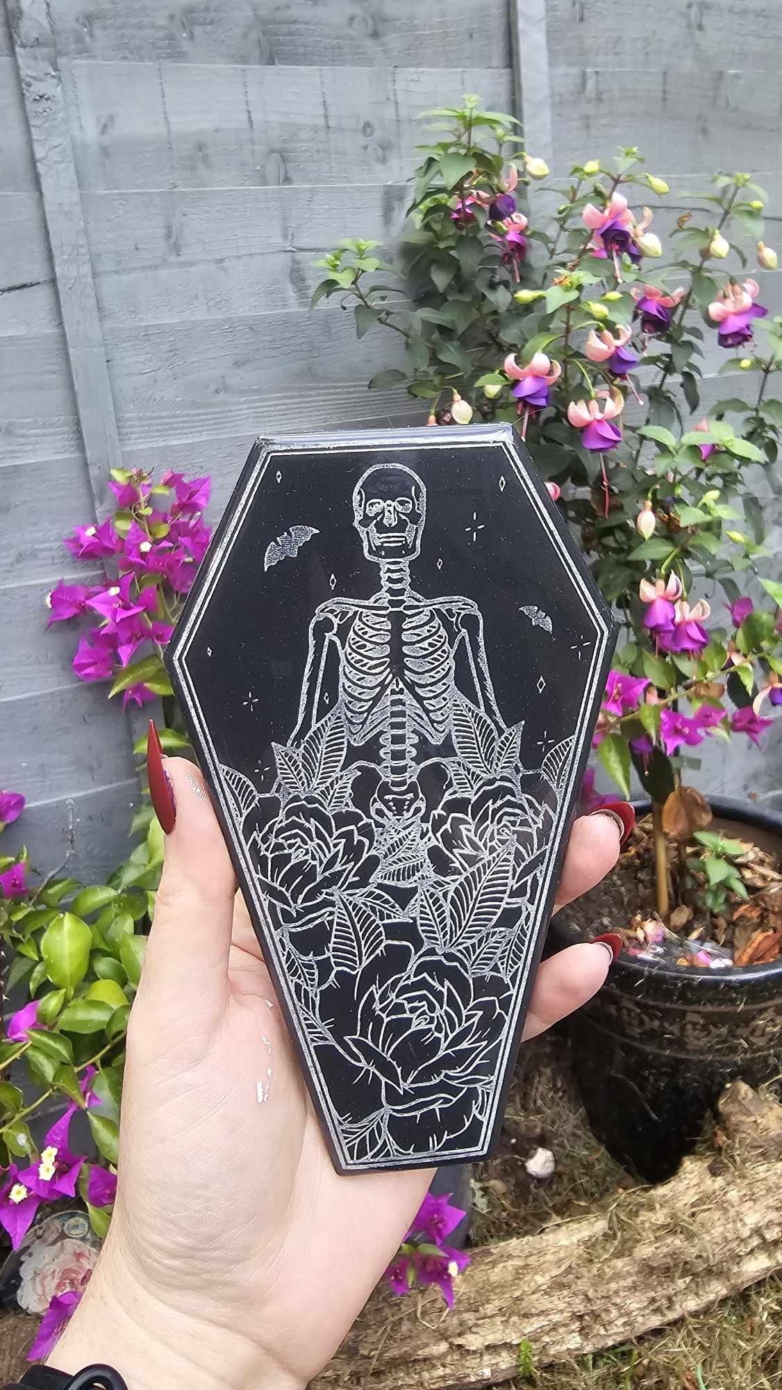 Hanging clip on the back to display beautifully on your gothic wall. Let this Gothic Coffin Plaque be centre of attention.